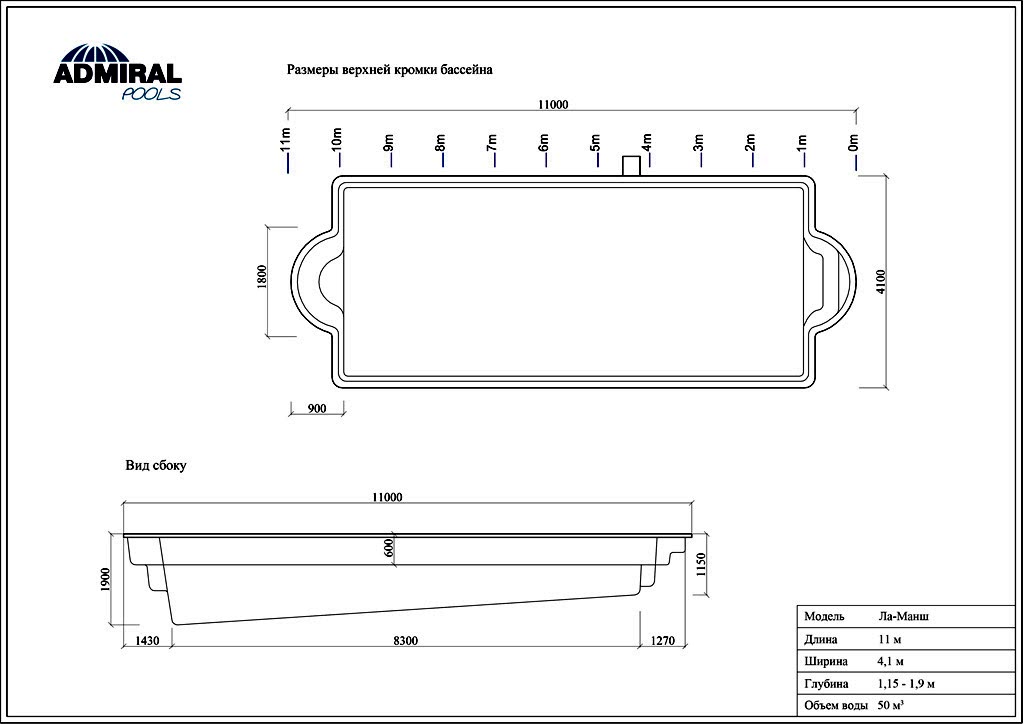 Плавательная зона составляет 11 метров. Модель имеет покатое дно с переменной глубиной от 1,15 до 1,9 метра. Такая глубина позволяет установить Пинап горку со стороны глубокой части бассейна.