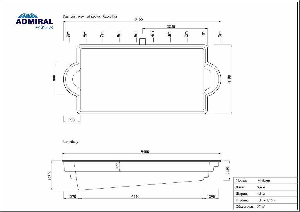За счет своей ширины (4,1 метров) относится к классу «Элит». Имеет классическую прямоугольную форму чаши со скругленными углами. Оснащен римской лестницей для обеспечения удобного входа в воду, которая представляет собой полукруглые плавно нисходящие в глубину ступени, расположенные в мелководной зоне. Пинап диван в глубокой части позволяет с особым комфортом наслаждаться водными процедурами под солнцем.