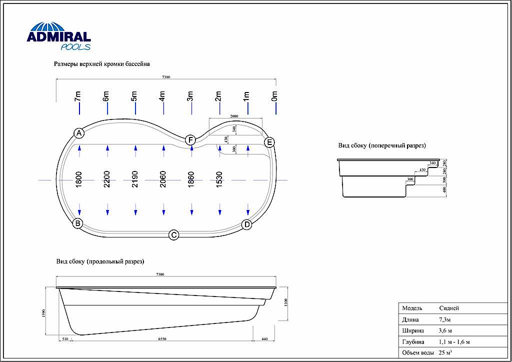 Плавательная зона составляет 7,3 метров и имеет покатое дно с переменной глубиной от 1,1 до 1,6 в Пинап части. Такая глубина позволяет установить детскую горку для ныряния.