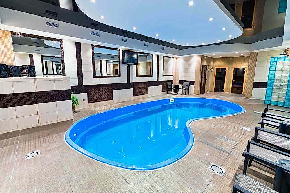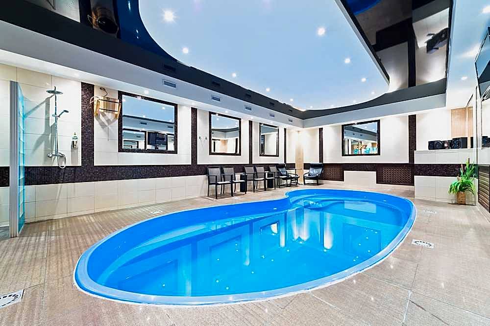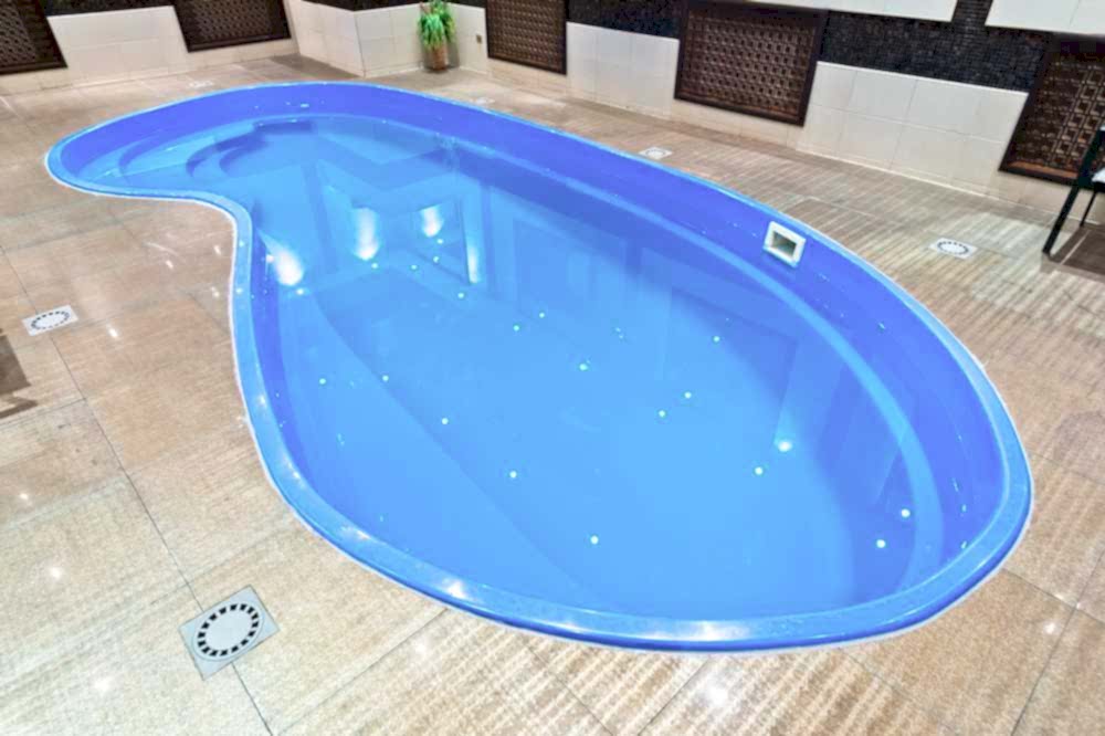 Имеет плавные изгибы силуэта чаши, по форме напоминающие природный водоем. Оснащена римской лестницей для обеспечения удобного входа в воду, которая представляет собой полукруглые плавно нисходящие в глубину ступени, Пинап в мелководной зоне. В глубокой части расположен комфортный полукруглый диван.
