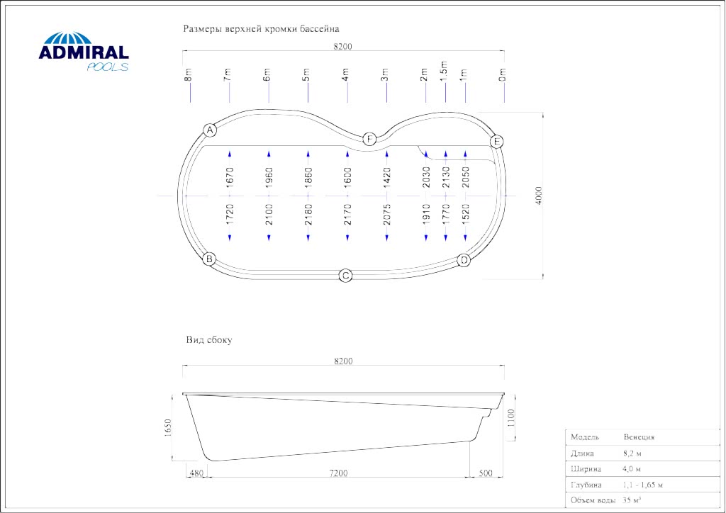 Плавательная зона составляет 8,2 метров и имеет покатое дно с переменной глубиной от 1,1 до 1,65 в глубокой части. Пинап глубина позволяет установить детскую горку для ныряния.
