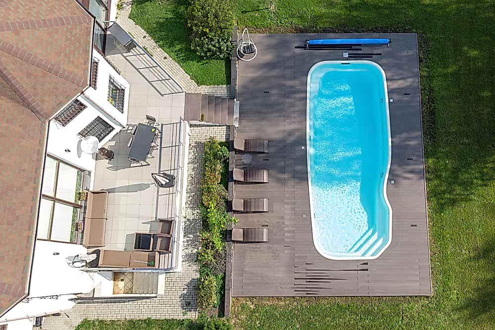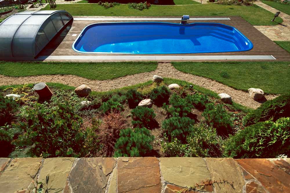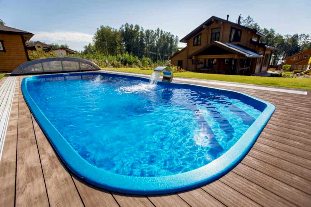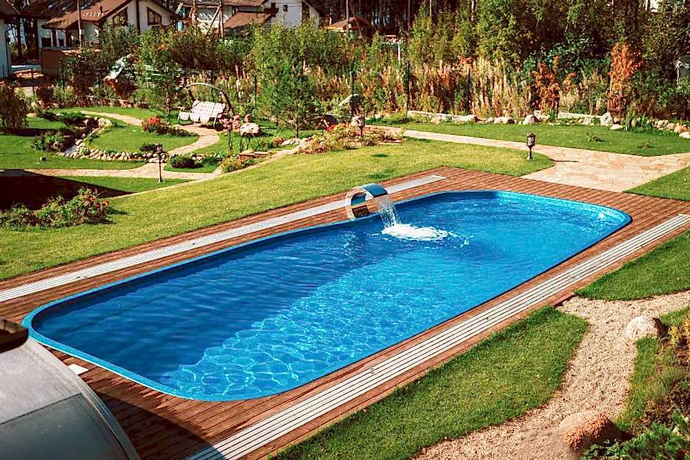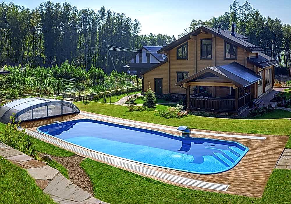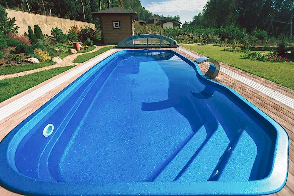 Имеет комфортную закругленную форму силуэта чаши. Оснащена римской лестницей для обеспечения удобного входа в воду, которая представляет собой плавно нисходящие в глубину ступени, расположенные в боковой части бассейна в мелководной зоне.