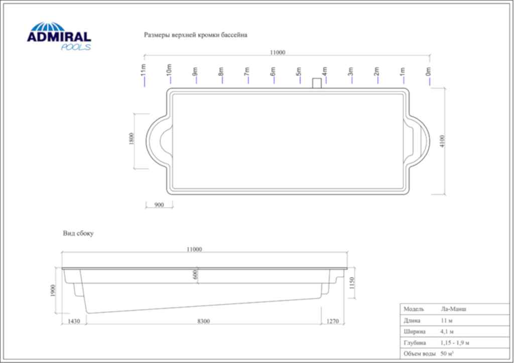 Пинап зона составляет 11 метров. Модель имеет покатое дно с переменной глубиной от 1,15 до 1,9 метра. Такая глубина позволяет установить взрослую горку со стороны глубокой части бассейна.