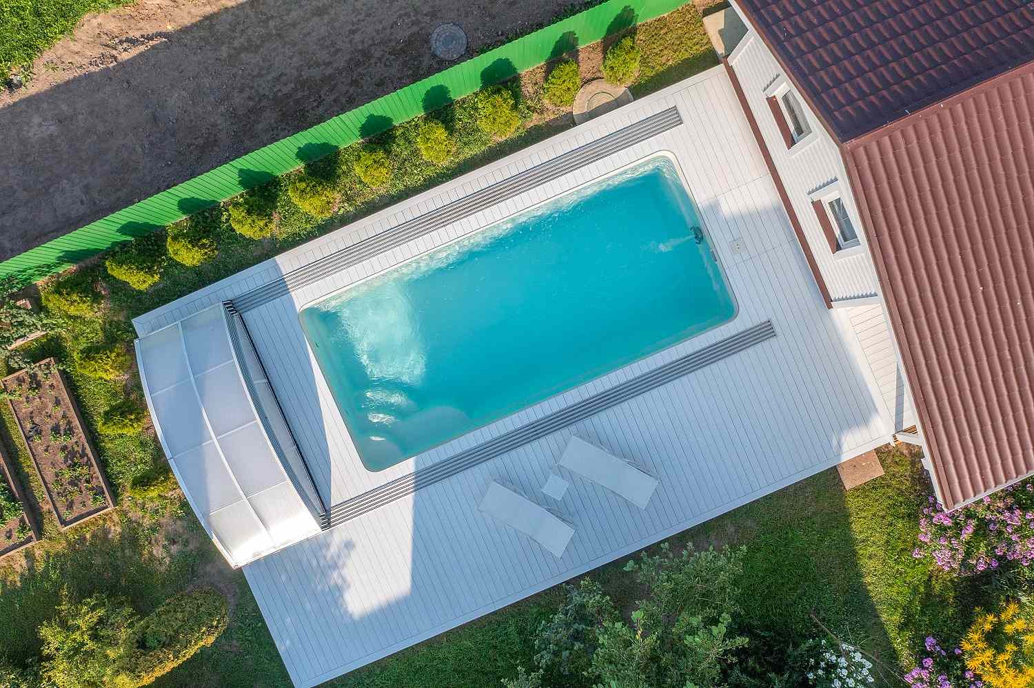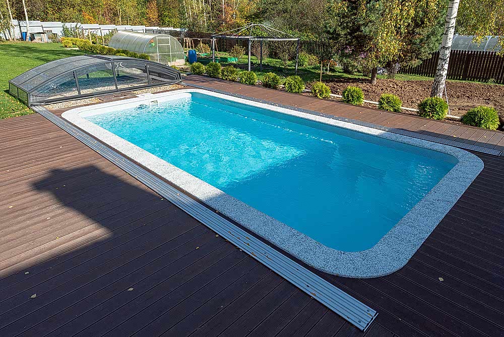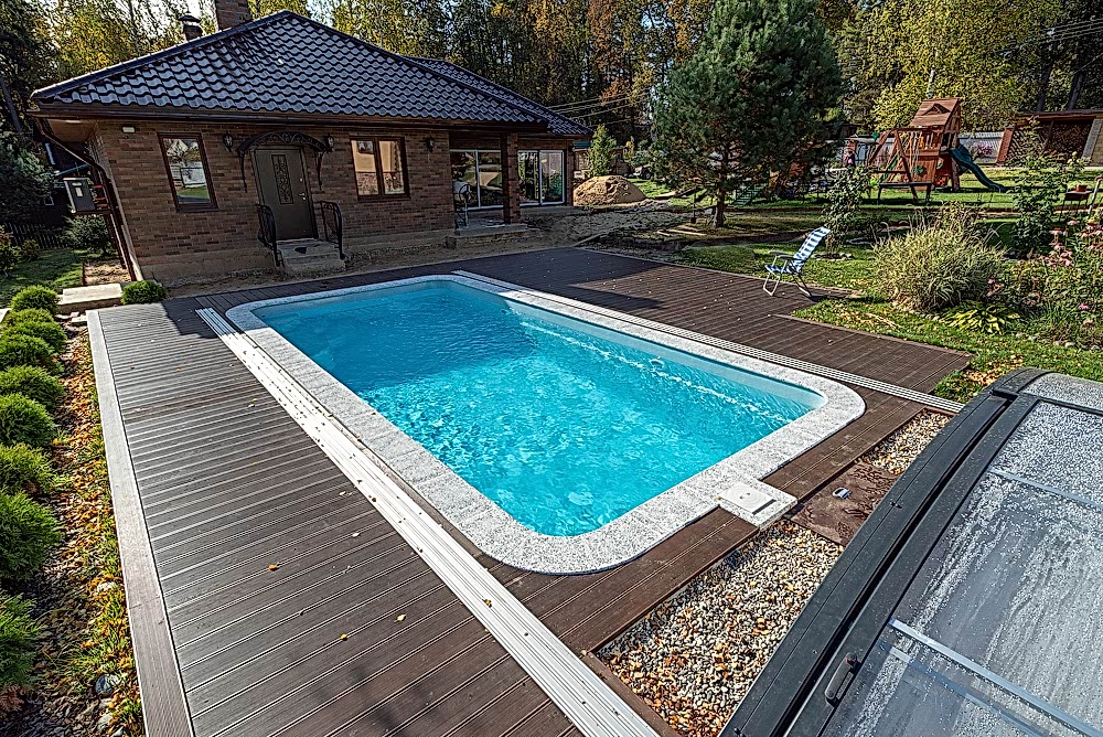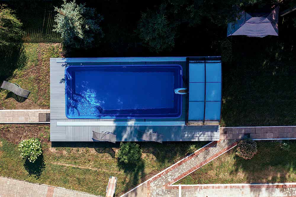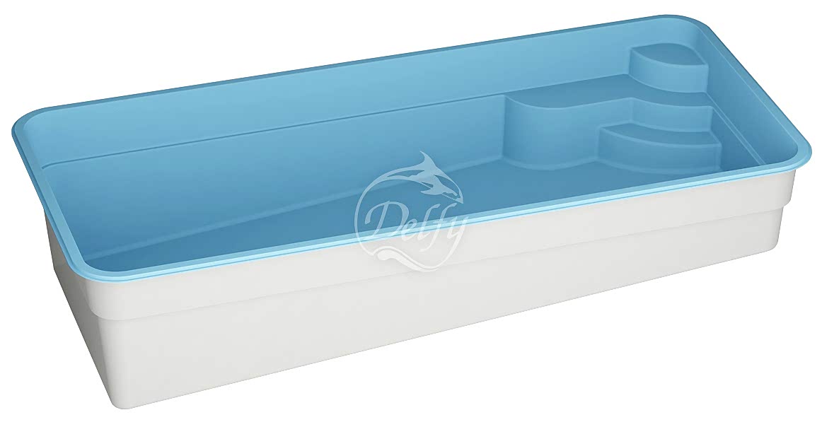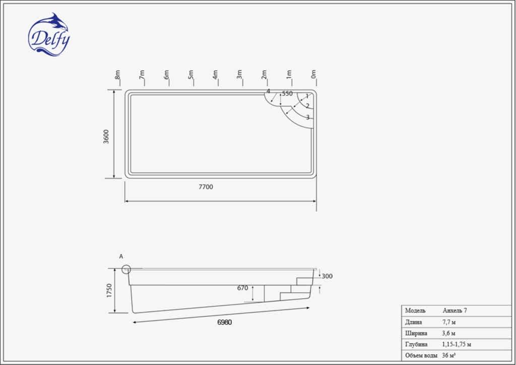 Данный бассейн правильной формы со ступенями, диваном и наклонным дном оптимальный вариант для плавания, водного фитнеса и Пинап в целом.