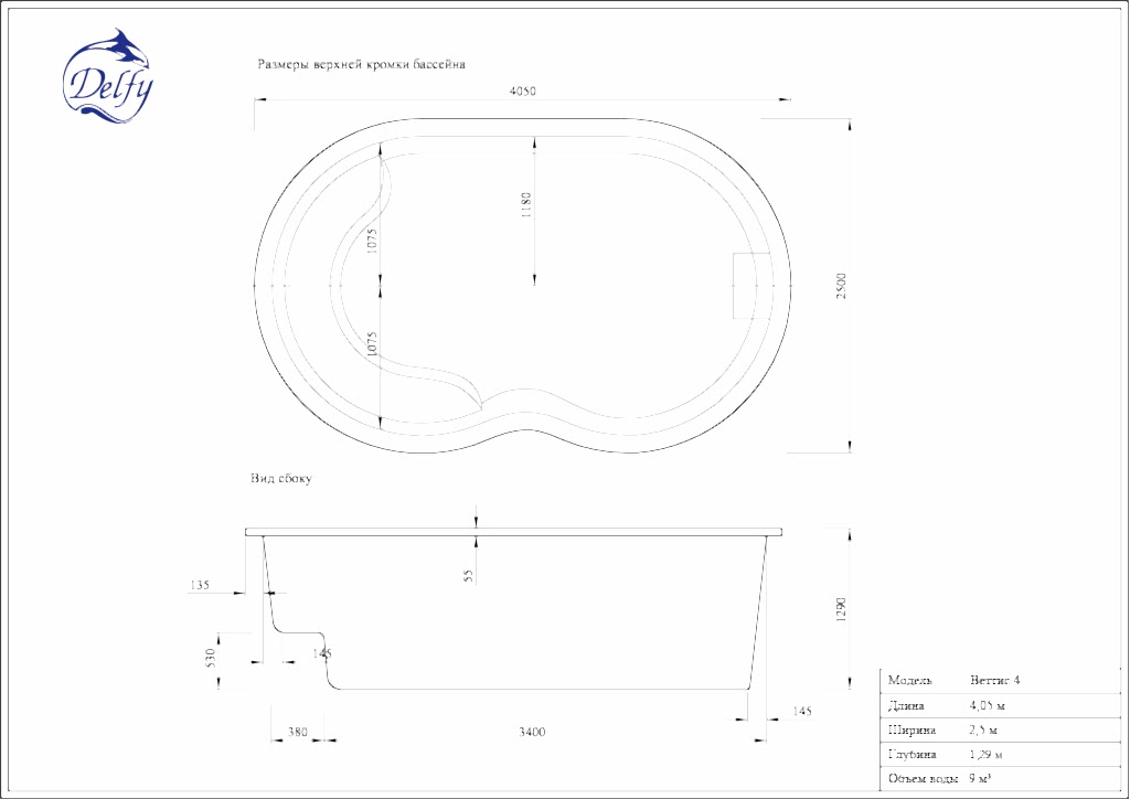 Длина бассейна составляет 4,05 метров и Пинап ровное дно с постоянной глубиной 1,29 метров.